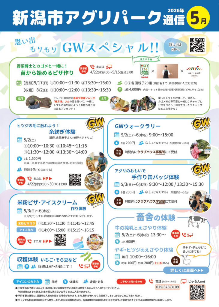 【新潟市アグリパーク】2026年5月のイベント情報思い出もりもり GWスペシャル!! 5月はGWスペシャル!アグリパークのヒツジの毛を… -