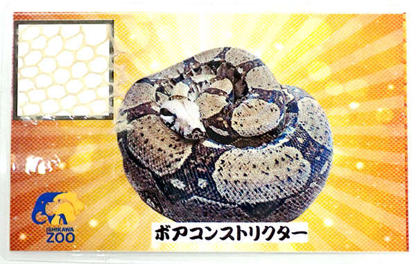 いしかわ動物園 | エントランス (券売) | ・園内各所で行われているガイドイベント ・ふれあい体験館で開催されるイベント3種 (お世話ガイド、ウサギのきもち、モルモットの行進) ※動物の体調により、中止する場合があります。 ※エントランスの本日のイベントスケジュールをご確認ください。 ※当日の好きなガイドを聞いて職員にスタンプくださいと言ってください。 | ![]() ボアコンストリクターの抜け殻 |