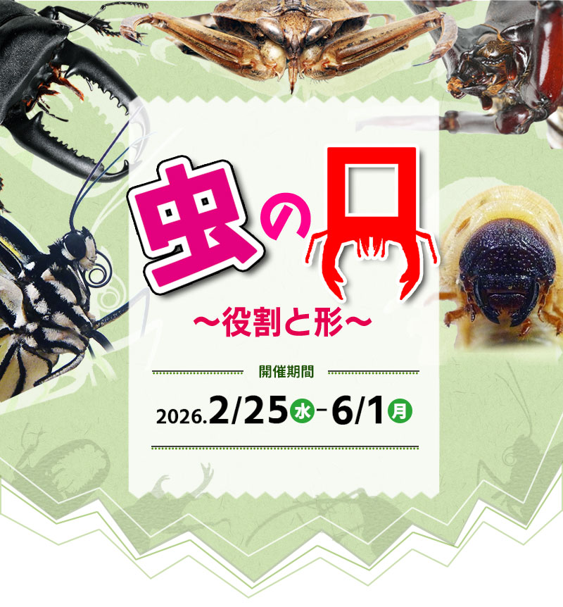 かむ口、すう口、なめる口など昆虫たちの「口」にスポットを当てた企画展示を開催します。昆虫の口がどんな形をし、どんな役割を持っているのかを楽しく解説します。