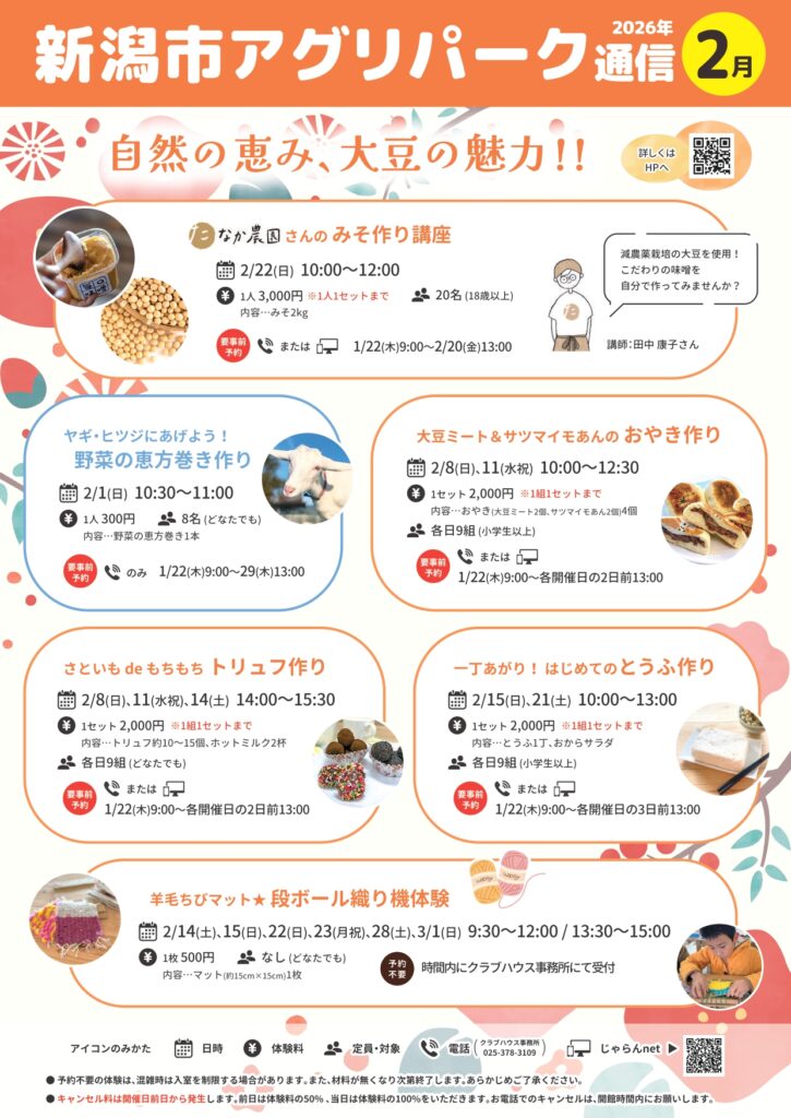 2月は、代替肉の一つである大豆ミートなどを使った「おやき作り」やいちから手間ひまかけて作る「はじめてのとうふ作り」など楽しいイベントが盛りだくさん!詳しくはHPやSNSをご覧ください。