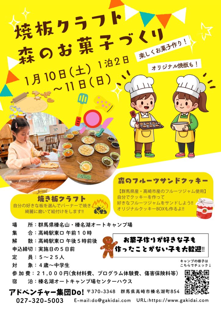 内容:自然の恵みたっぷりなお菓子をみんなで作ります。また、板をバーナーで焼き、新聞紙で磨いて彩色する、焼き板クラフトを作ります。