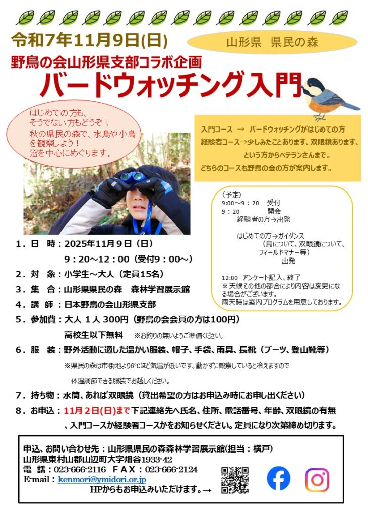 野鳥の会山形県支部とのコラボ企画です。初めての方へは双眼鏡の選び方や使い方からレクチャーしますので安心してご参加ください。経験者コースは野鳥の会定例探鳥会と同行し、県民の森内を巡り観察します。
