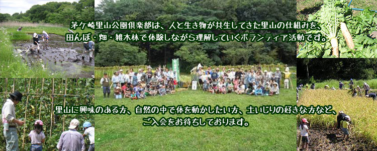 「茅ケ崎里山公園倶楽部」は、人と生き物が共生してきた里山の仕組みを、田んぼ・畑・竹林・雑木林で体験しながら理解していくボランティア活動です。 里山に興味のある方、自然の中で体を動かしたい方、土いじりの好きな方など、ご入会をお待ちしております。