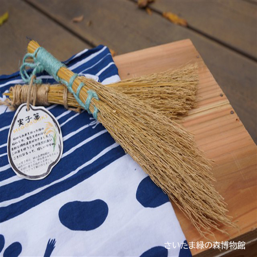 緑の森博物館で収穫した稲わらの穂の部分を使い、小さなほうき作りをします。「みご」は「実子」と書き、稲の穂先の部分のこと。稲を大事していた昔の暮らし方で、自然に優しい掃除道具を作りましょう!