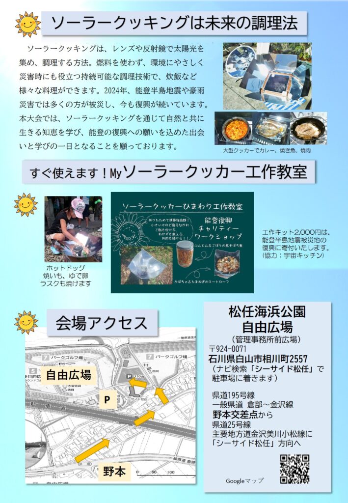 当日は、ソーラークッキングの実演をはじめ、来場者が参加できる体験プログラムや多様な団体の出展もあり、初夏の屋外でにぎわいのあるひとときをお届けします。