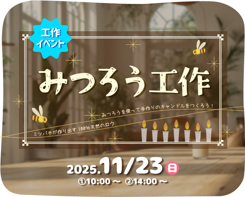 「みつろう(蜜蝋)」はミツバチが巣を作るために分泌する100%天然のロウ。温めて柔らかくした「みつろう」を、こねて、伸ばして、くるくる巻いて、自分だけのオリジナルろうそくを作ります♪